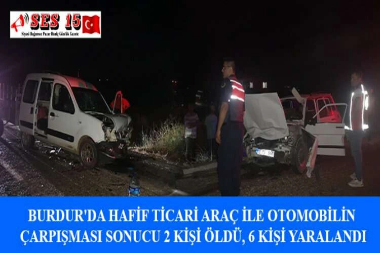 Burdur'un Tefenni ilçesinde otomobil ile hafif ticari aracın çarpıştığı kazada 2 kişi öldü, 2'si çocuk 6 kişi yaralandı. Galip Dua (54) idaresindeki 07 DEC 46 hafif ticari araç, Tefenni-Korkuteli kara yolu Işıklar Mahallesi Kavşağı'nda, Yunus Kılınç'ın (63) kullandığı 20 YS 088 plakalı otomobille çarpıştı. İhbar üzerine kaza yerine sağlık, jandarma ve itfaiye ekipleri sevk edildi. Sağlık ekibi otomobilde bulunan yaralılardan Mehmet Çelikli'nin (39) kaza yerinde hayatını kaybettiğini belirledi. Kazada sürücüler Dua ve Kılınç'ın yanı sıra araçlarda bulunan 2'si çocuk 5 kişi yaralandı. Sağlık ekiplerince çevredeki hastanelere kaldırılan yaralılardan İbrahim Dua (78) müdahaleye rağmen kurtarılamadı. AA