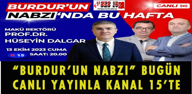 Kanal 15 ekranlarında yayınlanan “Burdur’un Nabzı” programı bugün canlı yayınla Kanal 15 izleyicisi ile buluşuyor. Bilal Karasakal’ın moderatörlüğünü yaptığı “Burdur’un Nabzı” programının canlı yayın konuğu Mehmet Akif Ersoy Üniversitesi Rektörü Prof. Dr. Hüseyin Dalgar olacak. “Burdur’un Nabzı” programında MAKÜ’nün kurulduğu tarihten bu yana gelişimi masaya yatırılacak. MAKÜ’nün eğitim durumu, akademik kadrosu, vizyonu, misyonu, ihtisaslaştığı alanlar ve yürüttüğü projelerin ele alınacağı, Rektör Dalgar’ın konuk olacağı Burdur’un Nabzı programında Burdur Gazeteciler Cemiyeti Başkanı Kürşat Tuncel de yer alacak. Bugün saat 20.00’da Kanal 15 ekranlarında canlı yayınla izleyiciye ulaşacak olan Burdur’un Nabzı programını kaçırmayın, Burdur ve ülke gündemi hakkında güncel konulardan geri kalmayın. MEHMET SEVİNÇ