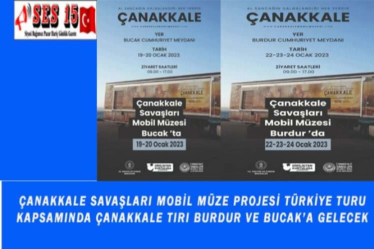 “ Çanakkale Savaşları Mobil Müzesi Projesi” Çanakkale tırı 19-20 Ocak 2023 Bucak’ta , 22 Ocak 2023 (Burdur Merkez İlçe) ve 23-24 Ocak 2023 (Burdur Merkezde olacak. Konuyla ilgili olarak Burdur Valiliği tarafından yapılan açıklamada; “ (T.C. Çanakkale Savaşları Gelibolu Tarihi Alan Başkanlığı tarafından Milli Şuurumuzun geliştirilerek Çanakkale Ruhu'nun gelecek kuşaklara aktarılması amacıyla hazırlanan ve T.C. Cumhurbaşkanlığı'nın 180 Günlük Eylem Planı'nda yer alan, “Çanakkale Savaşları Mobil Müzesi Projesi” belirlenen rota güzergâhı çerçevesinde organizasyonlarına devam etmektedir. Bu kapsamda, Çanakkale Savaşları Mobil Müzesi ilimizde; -19-20 Ocak 2023 (Bucak İlçesi/İlkokullar-Ortaokullar) tarihlerinde Bucak Cumhuriyet Meydanı’nda, 22 Ocak 2023 (Burdur Merkez İlçe) ve 23-24 Ocak 2023 (Burdur Merkez İlçe/İlkokullar-Ortaokullar) tarihlerinde, Burdur Cumhuriyet Meydanı’nda, 09.00-17.00 saatleri arasında sergilenecektir. Kamuoyuna saygı ile duyurulur” denildi.