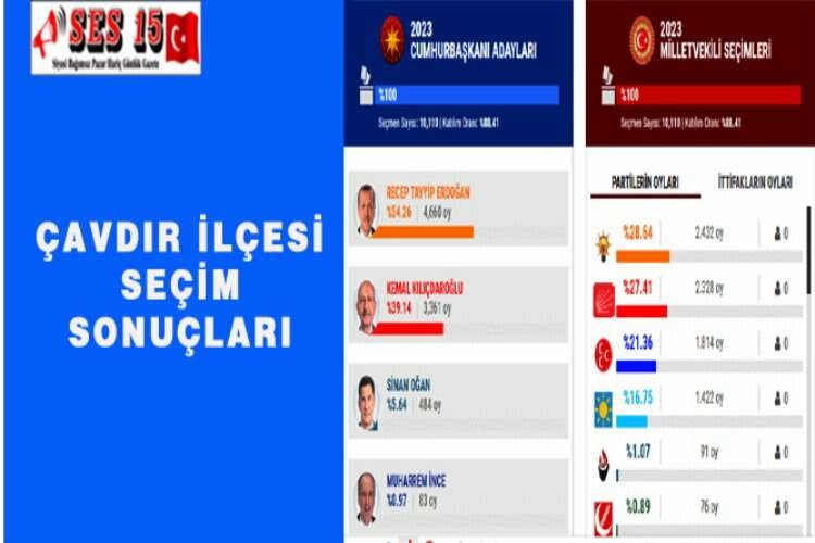 Cumhurbaşkanlığı ve 28. Dönem Milletvekilliği Seçiminde Çavdır ilçesi sonuçları şöyle oluştu. Cumhurbaşkanlığı seçimi : Recep Tayyip Erdoğan %54.26 - 4.660 oy Kemal Kılıçdaroğlu %39.14 – 3.361 oy Sinan Oğan % 5.64 – 484 oy Muharrem İnce %0.97 – 83 oy MİLLETVEKİLİ SEÇİMİ AK Parti % 28.64 -2 bin 432 oy CHP %27.41 – 2.328 oy MHP % 21.36 – 1.814 oy HABER MERKEZİ