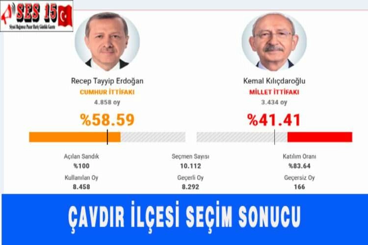 Cumhurbaşkanlığı seçiminde Burdur Çavdır İlçesinde oy dağılımı şu şekilde gerçekleşti. Çavdır: Recep Tayyip Erdoğan: % 58. 59- 4 bin 858 oy. Kemal Kılıçdaroğlu: % 41. 41- 3 bin 434 oy. HABER MERKEZİ