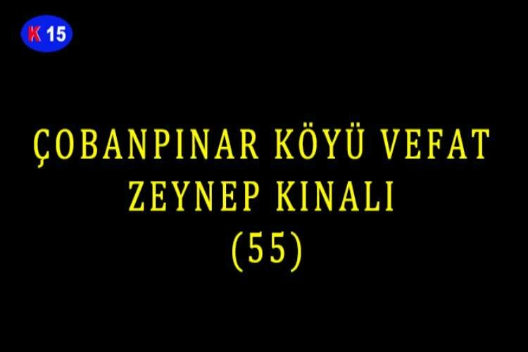 Çobanpınar Köyü'nden, merhum Ömer kızı, Ali Kınalı eşi, Zeynep Kınalı (55) vefat etmiştir. Cenazesi Çobanpınar Köyü Yukarı Mahalle de defnedilecektir. Eşi Ali Kınalı: 0 536 745 99 08 NOT: Pandemi sürecinden dolayı Cenazeler sadece birinci derece yakınları tarafından defnedilecektir. Geçmişlerimizin, sevdiklerimizin, geride bir Fatiha okuyacak kimsesi kalmamış müslüman kardeşlerimizin , Vatanımız ve Dinimiz uğruna şehit olan tüm Şehitlerimizin ruhları için, ALLAH Rızası için, 1 Fatiha 3 ihlas-ı Şerif okuyalım.