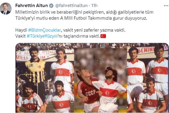 Altun, sosyal medya hesabından A Milli Futbol Takımı için hazırlanan klibi paylaştı. Fahrettin Altun, "BizimÇocuklar" ve "TürkiyeYüzyılı" etiketleriyle yaptığı paylaşımda, "Milletimizin birlik ve beraberliğini pekiştiren, aldığı galibiyetlerle tüm Türkiye’yi mutlu eden A Milli Futbol Takımımızla gurur duyuyoruz. Haydi, bizim çocuklar, vakit yeni zaferler yazma vakti. Vakit Türkiye Yüzyılı'nı taçlandırma vakti." ifadelerini kullandı. Klipte, A Milli Futbol Takımı'nın maçlarından ve Cumhurbaşkanı Recep Tayyip Erdoğan'ın futbol oynadığı anlardan kesitler ile Türkiye'nin tarihi ve kültürel değerlerini yansıtan görüntüler de yer aldı.