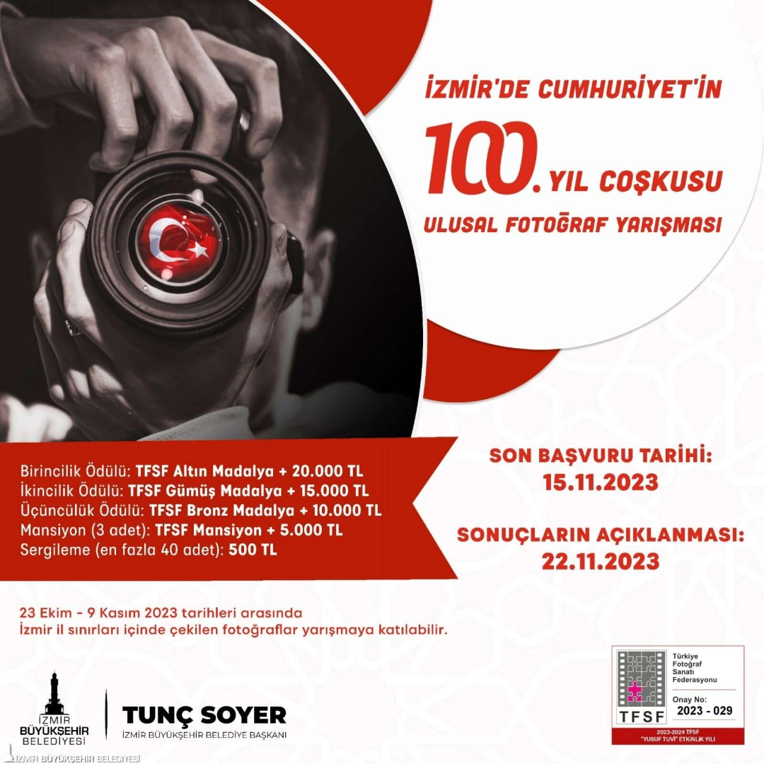 İzmir Büyükşehir Belediyesi, Cumhuriyet’in 100. yıl coşkusunu İzmir’de düzenlenecek etkinliklerle belgelemek isteyen fotoğrafçılar için ulusal fotoğraf yarışması düzenliyor. Cumhuriyet tarihinin bu anlamlı gününde yapılacak etkinliklere arşiv olacak nitelikteki yarışmada 23 Ekim-9 Kasım 2023 tarihleri arasında İzmir’deki kutlamalar sırasında çekilen fotoğraflar değerlendirilecek. Son katılım tarihinin 15 Kasım olduğu yarışmada, birincilik ödülü 20.000 Lira olacak. İzmir Büyükşehir Belediyesi, Cumhuriyet’in 100. yılı kutlamaları kapsamında “İzmir’de Cumhuriyet’in 100. Yıl Coşkusu” konulu Ulusal Fotoğraf Yarışması düzenliyor. İzmir Büyükşehir Belediyesi Kültür ve Sanat Dairesi Başkanlığı tarafından düzenlenen yarışmada, fotoğraf sanatı aracılığı ile Cumhuriyet’in 100. yılı kapsamında yapılacak etkinlik ve kutlamaların belgelenmesi, amatör-profesyonel fotoğrafçıların İzmir’de buluşturulması, kentteki bu tarihi günlere ait görsel bellek oluşturulması amaçlanıyor. Yarışmada 23 Ekim-9 Kasım 2023 tarihleri arasında çekilen fotoğraflar değerlendirmeye alınacak. Türkiye Fotoğraf Sanatı Federasyonu desteği ile düzenlenen yarışma fotoğrafa ilgi duyan 18 yaş üstü tüm amatör ve profesyonel fotoğrafçılara açık olacak. Yarışmaya İzmir kent merkezinin yanı sıra, İzmir’in ilçelerinde ve köylerinde yapılacak her türlü etkinlikte çekilen fotoğraflarla katılmak mümkün. Ancak geçmiş yıllarda çekilen fotoğraflar yarışmaya katılamayacak. Yarışmanın birincilik ödülü 20.000, ikincilik ödülü 15.000, üçüncülük ödülü 10.000, mansiyon ödülü 5.000 TL olacak. Ayrıca sergilemeye değer bulunan 40 fotoğraf 500 TL ile ödüllendirilecek.