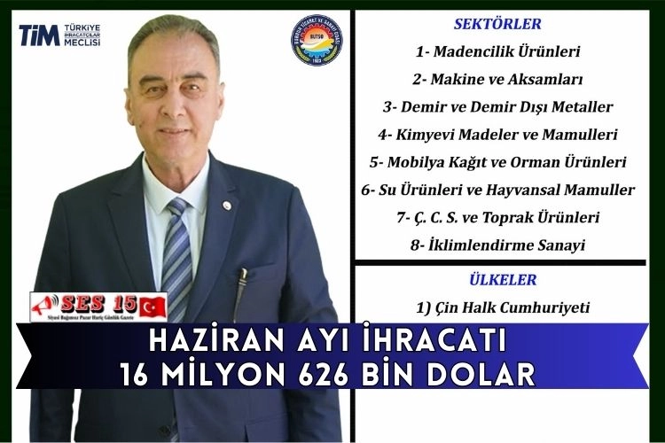 Türkiye İhracatçılar Meclisi’nin (TİM) aylık olarak güncellediği veriler hakkında açıklama yapan Yönetim Kurulu Başkanı Yusuf KEYİK: “İlimizin 2023 yılı haziran ayı ihracatı 22 milyon 169 bin 170 dolar, bu yılın haziran ayı ihracatı ise %25’lik düşüşle 16 milyon 626 bin 160 dolar oldu. Geçen yılın aynı ayına göre 5 milyon 543 bin 010 dolarlık daha az ihracat gerçekleştirdik. (Geçen yılın ilk 6 ayına göre ihracatımızda %0,2’lik artış gerçekleşti)