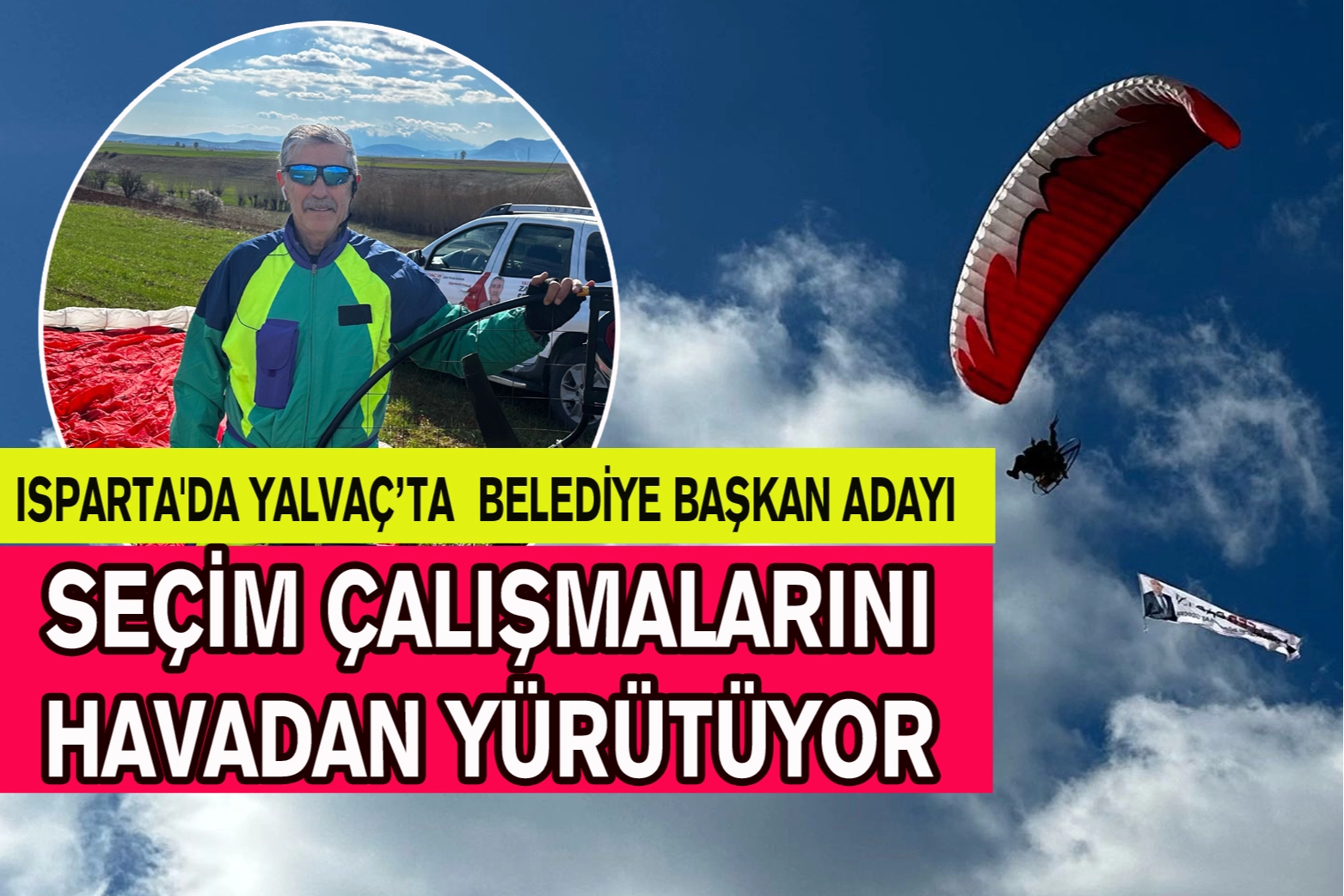 Hollanda ve Türkiye'de aldığı uçuş eğitimleri ile paramotorlu yamaç paraşütü sporcusu olan 68 yaşındaki Yalvaç, bu tutkusunu seçim propagandasında da kullanıyor.