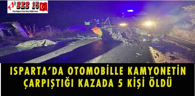 Isparta'nın Şarkikaraağaç ilçesinde otomobille kamyonetin çarpışması sonucu 1'i çocuk 5 kişi öldü, 2 kişi yaralandı. Bayram Ali E. idaresindeki 32 LH 760 plakalı otomobil, Aşağıdinek köyü dört yol mevkisinde M.D'nin kullandığı 42 AID 166 plakalı kamyonetle çarpıştı. İhbar üzerine kaza yerine 112 Acil Sağlık ve jandarma ekipleri sevk edildi. Sağlık ekipleri, otomobil sürücüsü Bayram Ali E. ile otomobilde bulunan Kadir E. ve 8 yaşındaki Z.Ç'nin kaza yerinde hayatını kaybettiğini belirledi. Kazada yaralanan kamyonet sürücüsü M.D. ve otomobildeki Azerbaycan uyruklu Semira R. ile Zilan K. ve Mustafa Ali E. çevredeki hastanelere kaldırıldı. Şarkikaraağaç Doktor Sadettin Bilgiç Devlet Hastanesi'ne kaldırılan yaralılardan Semira R. ile Isparta Şehir Hastanesi'nde tedavi gören Zilan K. müdahaleye rağmen kurtarılamadı. Yaralılardan Mustafa Ali E'nin durumunun ağır olduğu öğrenildi. AA