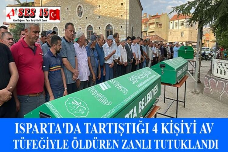 Isparta'nın Şarkikaraağaç ilçesinde tartıştığı 4 kişiyi av tüfeğiyle öldüren şüpheli, tutuklandı. Yenicekale köyü Hasanderesi mevkisinde, dün, çıkan tartışmanın kavgaya dönüşmesi sonucu 4 kişiyi av tüfeğiyle öldüren zanlı Hayrettin T'nin (70) jandarmadaki işlemleri tamamlandı. Adliyeye sevk edilen şüpheli, çıkarıldığı sulh ceza hakimliğince tutuklandı. Olayda yaşamını yitiren Adnan (27), İmran (39) ve Osman Karakoç (36) ile Bedrettin Deniz'in (46) cenazesi de işlemlerin ardından Isparta Şehir Hastanesi morgundan alınarak Gelendost ilçesine götürüldü. Cenazeler, Abuldulgaffar Camisi'nde kılınan cenaze namazının ardından aile kabristanlığına defnedildi.