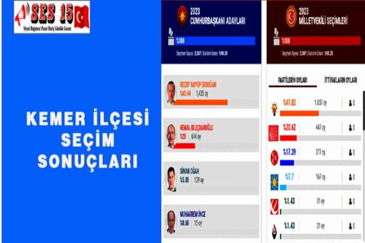 Cumhurbaşkanlığı ve 28. Dönem Milletvekilliği Seçiminde Kemer ilçesi sonuçları şöyle oluştu. Cumhurbaşkanlığı seçimi : Recep Tayyip Erdoğan %65.44 – 1.435 oy Kemal Kılıçdaroğlu %28 - 614 oy Sinan Oğan %5.88 – 129 oy Muharrem İnce %0.68 – 15 oy MİLLETVEKİLİ SEÇİMİ AK Parti % 47.83 -1.037 oy CHP % 20.62 -447 oy MHP % 17.39 -377 oy HABER MERKEZİ