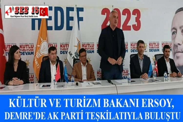 Kültür ve Turizm Bakanı Mehmet Nuri Ersoy, Antalya'nın Demre ilçesinde AK Parti İlçe Teşkilatı üyeleriyle bir araya geldi. Ersoy, partililerle sohbet ederek, ilçede yapılan çalışmalar hakkında bilgi verdi. İlçede bulunan Aziz Nikolaos Kilisesi Anıt Müzesi'nin Antalya turizmi açısından önemli olduğunu ifade eden Ersoy, kilisede önemli bakım ve restore çalışmalarının yapıldığını bildirdi. Türkiye'de yapılan yatırımlarla turizmin de gelişme kaydettiğini ifade eden Ersoy, terörle etkin mücadele yürütüldüğünü, ulaşımın konforlu hale getirildiğini kaydetti. Küresel salgın döneminde de Türkiye'nin başarılı bir çalışma ortaya koyduğunu aktaran Ersoy, Güvenli Turizm Sertifika Programı ile turist ağırlamaya devam ettiğini söyledi. Bakan Ersoy, bu yıl turizm rakamlarının çok iyi ilerlediğini belirterek, yıl sonu hedeflerine ulaşmayı beklediklerini kaydetti. Antalya Havalimanı'nın kapasitesini de artırdıklarını dile getiren Ersoy, turizmden her sektörün kazandığını bildirdi. AA