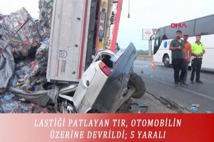 Antalya’da, lastiği patlayan tırın seyir halindeki otomobilin üzerine devrilmesi sonucu 5 kişi ağır yaralandı. Edinilen bilgilere göre; kaza Cuma günü saat 19.00 sularında D-400 Antalya-Alanya karayolu Serik ilçesi Kozağacı mevkiinde meydana geldi. Alanya’dan Antalya yönüne giden Mustafa Demir yönetimindeki 07 UN 775 plakalı geri dönüşüm malzemesi yüklü tır, ön sol lastiğinin patlaması sonucu sürücüsünün direksiyon hakimiyetini kaybetmesiyle aynı yönde ilerleyen İsmail Uğur Bin yönetimindeki otomobilin üzerine devrildi. Tır, otomobili altına alarak yaklaşık 100 metre sürükledi. Tır şoförü Mustafa Demir’in yara almadan kurtulduğu kazada, otomobil sürücüsü İsmail Uğur Bin, araçta bulunan Durali Bin, Nezahat Bin ve kimliği tespit edilemeyen 2 kişi otomobilde sıkışarak ağır yaralandı.