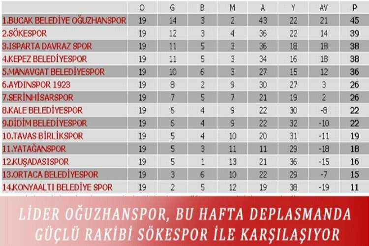 Bölgesel Amatör Lig 7. Grupta ligin bitimine 20. hafta maçları Pazar günü bugün oynanacak. Bucak Belediyesi Oğuzhanspor, bu hafta deplasmanda güçlü rakibi Sökespor ile karşılaşacak. Bugün Aydın Söke ilçe stadında saat 14:00da oynanacak olan karşılaşmayı Hakemler Aydoğan Kaçmaz, Selman Kılınç, Kamil Dinçer ve Fatih Sayar yönetecek. Oğuzhanspor Sökespor deplasmanından 3 puanla dönerek ligdeki başarısını sürdürmeyi hedefliyor. Lider Oğuzhanspor, karşılaşma için taraftarlarının desteğini bekliyor.