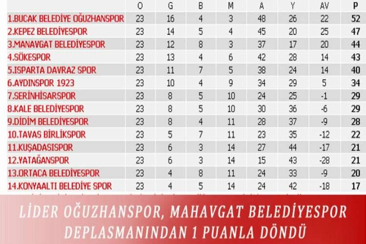 Bölgesel Amatör Lig 7. Grupta 23. hafta maçları Pazar günü oynandı. Bucak Belediyesi Oğuzhanspor, bu hafta deplasmanda Manavgat Belediyespor ile karşılaştı. Maç 0-0 beraberlikle sonuçlanırken, Lider Oğuzhanspor deplasmandan 1 puanla döndü. Pazar günü saat 15.00’te Manavgat İlçe Stadında oynanan karşılaşmayı Hakemler Barış Asım Ünal, Müjde Arça, Hüseyin Asım Kılıç ve Mert İlhan Sarıgül yönetti. Deplasmanda Lider Oğuzhanspor, güçlü rakibi Manavgat Belediyespor ile 0-0 berabere kaldı. Lider Oğuzhanspor, karşılaşma sonucunda puanını 52’ye çıkarırken, lider Oğuzhansporu 47 puanla Kepez Belediyespor, 44 puanla Manavgat Belediyespor, 43 puanla Sökespor ve 40 puanla Isparta Davraz Spor takip etti. Deplasmandan 1 puanla dönen Lider Oğuzhanspor ile yakın takipçisi Kepez Belediyespor arasındaki puan farkı da 5e düştü. Ligin bitmesine 3 hafta kalırken Oğuzhanspor 7 Nisan Pazar günü kendi evinde Serinhisarspor’u ağırlayacak. Lider Oğuzhanspor, ligde 29 puanla 7. Sırada yer alan Serinhisar karşılaşması için taraftardan ve Bucak halkından destek bekliyor.