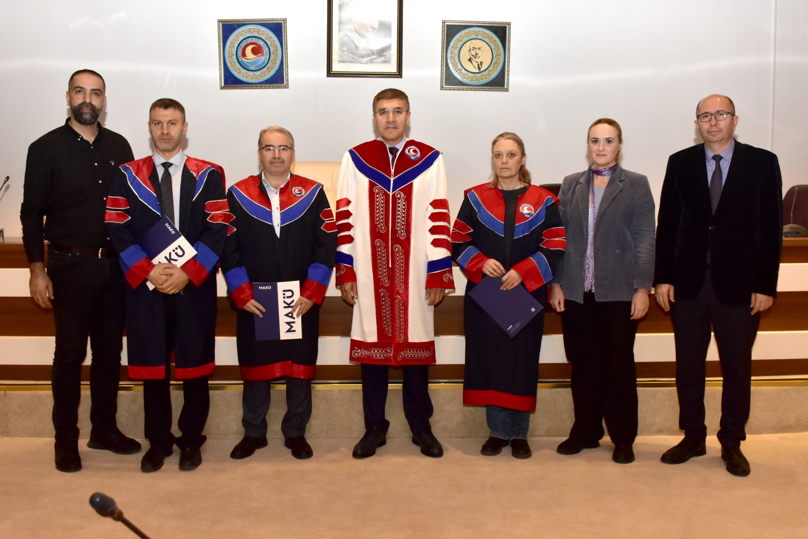 Konuşmalardan sonra biniş giyme törenine geçildi. Törende; MAKÜ Fen Edebiyat Fakültesi Sosyoloji Bölümü Kurumlar Sosyolojisi Anabilim Dalı Öğretim Üyesi Doç. Dr. Mim Sertaç Tümtaş, Fen Edebiyat Fakültesi Nanobilim ve Nanoteknoloji Bölümü Biyoteknoloji ve Nanoteknoloji Anabilim Dalı Öğretim Üyesi Doç. Dr. Nurettin Körözlü, Eğitim Fakültesi Matematik ve Fen Bilimleri Eğitimi Bölümü Fen Bilgisi Eğitimi Anabilim Dalı Öğretim Üyesi Doç. Dr. Huriye Deniş Çeliker, Veteriner Fakültesi Veteriner Hekimliği Temel Bilimleri Bölümü Veterinerlik Anatomisi Anabilim Dalı Öğretim Üyesi Doç. Dr. Yasin Demiraslan, Eğitim Fakültesi Temel Eğitim Bölümü Sınıf Eğitimi Anabilim Dalı Öğretim Üyesi Doç. Dr. Çiğdem Karabacak Atay, İktisadi ve İdari Bilimler Fakültesi İşletme Bölümü Muhasebe ve Finansman Anabilim Dalı Öğretim Üyesi Doç. Dr. Ali Cüneyt Çetin, Fen Edebiyat Fakültesi Tarih Bölümü Yeniçağ Tarihi Anabilim Dalı Öğretim Üyesi Doç. Dr. Reyhan Şahin Allahverdi, Veteriner Fakültesi Veteriner Hekimliği Temel Bilimleri Bölümü Veterinerlik Fizyolojisi Anabilim Dalı Öğretim Üyesi Doç. Dr. Özkan Şimşek, İlahiyat Fakültesi Temel İslam Bilimleri Bölümü Tefsir Anabilim Dalı Öğretim Üyesi Doç. Dr. Yasin Pişgin, İktisadi ve İdari Bilimler Fakültesi Siyaset Bilimi ve Kamu Yönetimi Bölümü Yönetim Bilimleri Anabilim Dalı Öğretim Üyesi Doç. Dr. Sabrina Kayıkcı, Fen Edebiyat Fakültesi Coğrafya Bölümü Türkiye Coğrafyası Anabilim Dalı Öğretim Üyesi Doç. Dr. Erol Kapluhan, İlahiyat Fakültesi Felsefe ve Din Bilimleri Bölümü Din Bilimleri Anabilim Dalı Öğretim Üyesi Doç. Dr. Orhan Gürsu, İktisadi ve İdari Bilimler Fakültesi İşletme Bölümü Yönetim ve Organizasyon Anabilim Dalı Öğretim Üyesi Doç. Dr. Hüseyin Çiçek’in profesörlük,