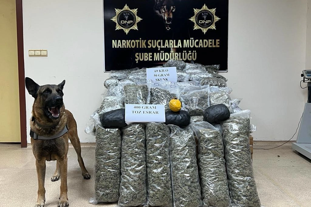Narkotik dedektör köpek yardımıyla yapılan aramada, aracın gizli bölmelerinde 69 kilo 50 gram sentetik uyuşturucu ile 400 gram esrar ele geçirildi.