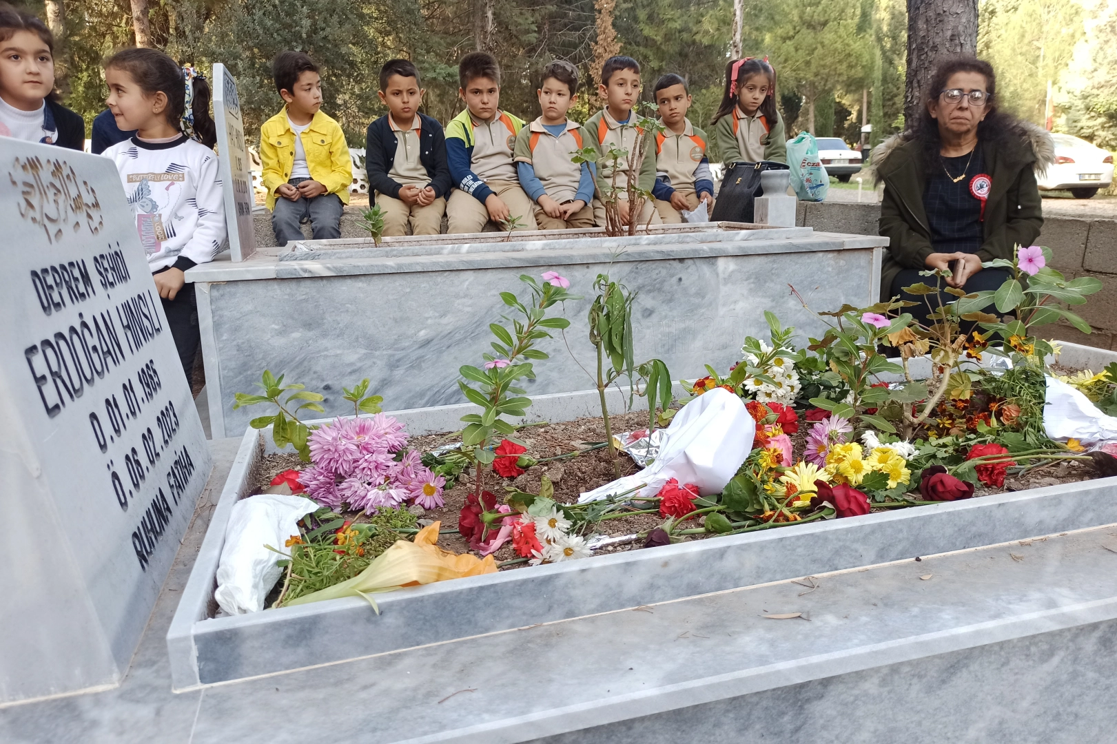 Depremde hayatını kaybeden öğretmenin mezarı başında Kur'an-ı Kerim okundu, dua edildi. Öğrenci ve öğretmenlerin mezara çiçek bıraktığı programda duygusal anlar yaşandı.