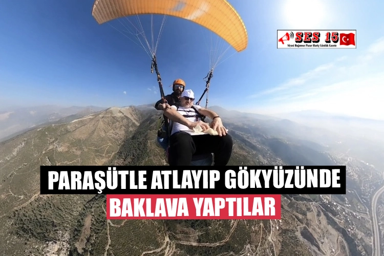 Amanos Dağları'ndaki kalkış alanına giden paraşüt pilotu İlker Özgüven ile baklava ustası Ali Paksoy, yanlarına tepsi, oklava, hamur gibi baklava yapımından kullanılan malzemeler ve ekipmanları da alıp yamaçtan havalanarak paraşütle tandem uçuşu gerçekleştirdi.
