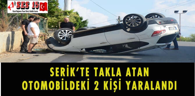Antalya'nın Serik ilçesinde otomobilin bahçe kapısına çarpıp takla atması sonucu biri çocuk 2 kişi yaralandı. Merve M.'nin kullandığı 34 HB 4281 plakalı otomobil, Gedik Mahallesi'nde yol kenarındaki bir evin demir bahçe kapısına çarpıp, takla attı. Kazada sürücü ile araçta bulunan 9 yaşındaki oğlu Erin M. yaralandı. İhbar üzerine kaza yerine polis, itfaiye ve sağlık ekipleri sevk edildi. Yaralılar, ilçedeki özel bir hastaneye kaldırıldı. AA