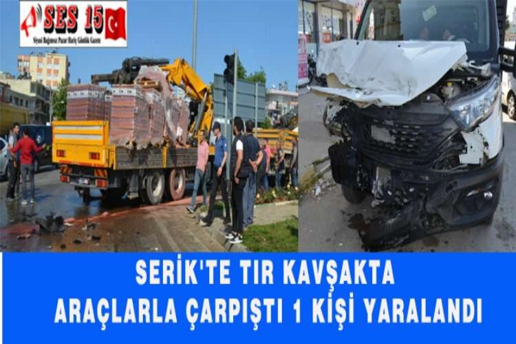 Antalya'nın Serik ilçesinde tırın, kavşaktaki araçlarla çarpışması sonucu bir kişi yaralandı. Serik ilçesi Antalya-Alanya D400 karayolu sanayi kavşağında, Mehmet Ç. idaresindeki 15 NH 353 plakalı tır, kavşaktaki trafik ışıklarından hareket eden Olcay K. idaresindeki plakası belirlenemeyen kamyonet ve Soner Ç.'nin kullandığı 07 YBZ 77 plakalı vinç kamyonuyla çarpıştı. Vatandaşların ihbarı üzerine kaza yerine polis ve 112 sağlık ekipleri sevk edildi. Kazada yaralanan kamyonet sürücüsü Olcay K. sağlık ekiplerinin ilk müdahalesinin ardından ambulansla Serik Devlet Hastanesine kaldırıldı. Yaralının sağlık durumunun iyi olduğu öğrenildi. Çarpışmanın etkisi ile kaza yerinden 100 metre ileride bulunan orta refüje çıkarak duran tırın deposundaki akaryakıtın dökülmesi üzerine yol trafiğe kapatıldı. Belediye ekiplerinin temizlik çalışmalarının ardından yol trafiğe açıldı. Vinç Sürücüsü Soner Ç. gazetecilere, Boğazkent mahallesinden gelirken sanayi kavşağında kırmızı ışıklarda beklemeye başladığını belirterek, "Yeşil yanınca hareket ettik. Yoldan geçtiğimiz sırada Antalya istikametinden gelen tır bizi biçti geçti. Önce minibüse vurdu. Ardından da bana vurdu." dedi. AA