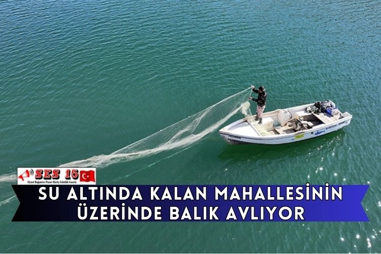 Sabahın ilk ışıklarıyla baraj gölüne açılan Taşhan, kuraklığın etkisiyle ortaya çıkan eski mahallesindeki yapıların yanından tekneyle geçerek ağlarını suya atıyor.