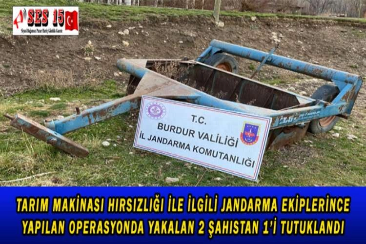 Burdur ili Tefenni İlçesi Hasanpaşa Köyü mülki sınırları içerisinde; İ.A isimli şahsın tarlasından tesfiye makinesinin kimliği belirsiz kişi/kişilerce çalınması olayı ile ilgili; İl Jandarma Komutanlığı ekipleri tarafından yapılan titiz ve detaylı çalışma neticesinde; şüpheli A.K. ve M.Ç. isimli iki şahıs Tefenni ilçesinde yakalandılar. Olayla ilgili şüpheli A.K. isimli şüpheli tutuklanarak Burdur E Tipi Kapalı Ceza İnfaz Kurumuna teslim edildi. Konuyla ilgili Burdur Valiliği tarafından yapılan açıklamada; “Güvenlik güçlerimiz tarafından ilimiz genelinde huzur ve güven ortamının sağlanmasına yönelik, mal varlığına karşı işlenen suçların önlenmesi, suç/suçluların tespiti ve yakalanmasına yönelik yürütülen çalışmalara kararlılıkla devam edilmektedir. Burdur ili Tefenni İlçesi Hasanpaşa Köyü mülki sınırları içerisinde; 14.12.2021 günü İ.A isimli şahsın tarlasından tesfiye makinesinin kimliği belirsiz kişi/kişilerce çalınması olayı ile ilgili; İl Jandarma Komutanlığı ekipleri tarafından yapılan titiz ve detaylı çalışma neticesinde; çalınan tesfiye makinası Karamanlı ilçesinde bulunarak İ.A. ya teslim edilmiştir. Olayla ilgili şüpheli A.K. ve M.Ç. isimli iki şahıs 25.12.2021 tarihinde Tefenni ilçesinde yakalanmışlardır. Adli işlemleri tamamlanan şüphelilerden A.K. tutuklanarak Burdur E Tipi Kapalı Ceza İnfaz Kurumuna teslim edilmiş, M.Ç. ise adli kontrol şartı ile serbest bırakılmıştır. Kamuoyuna saygıyla duyurulur” denildi.