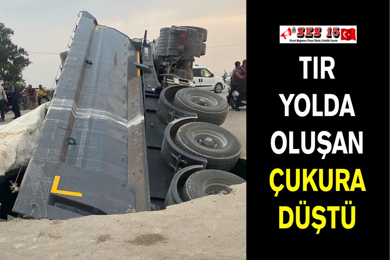 Sürücüsü öğrenilemeyen 01 AIL 179 plakalı kum yüklü tır, yolda oluşan çukura düştü.