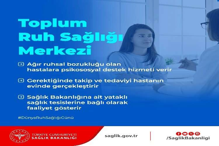 "Toplum Ruh Sağlığı Merkezleri" Ne İş Yapar? Ağır ruhsal bozukluğu olan hastalara toplum temelli ruh sağlığı modeli çerçevesinde, psikososyal destek hizmeti verir, gerektiğinde evde sağlık hizmetleri uygulamasına entegre bir şekilde takip ve tedaviyi hastanın evinde gerçekleştirir, Sağlık Bakanlığı'na ait yataklı sağlık tesislerine bağlı olarak faaliyet gösterir.