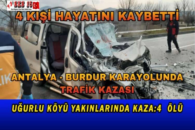Antalya-Burdur karayolu Bucak ilçesi Uğurlu köyü yakınlarında meydana gelen trafik kazasında 4 kişi hayatını kaybetti. Edinilen bilgilere göre, Bugün saat 08:00 sularında Uğurlu köyü yakınlarında 03 LD 193 plakalı ticari araç, aynı yönde seyir eden 15 AB 129 plakalı Tırın dorsesine arkadan çarptı. Çarpışma sonucu 03 LD 193 plakalı ticari araçta bulunan 4 kişi olay yerinde hayatını kaybetti. Kazada vefat edenlerin isimleri henüz belirlenemezken, cansız bedenleri Bucak Devlet Hastanesi morguna kaldırıldı. Olayla ilgili olarak soruşturma başlatıldı.