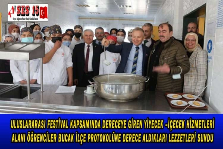 Bucak Oğuzhan Mesleki ve Teknik Anadolu Lisesi Yiyecek-İçecek Hizmetleri Alanı öğrencileri; Bucak ilçe protokolüne 18. Uluslararası Gastronomi Festivali kapsamında düzenlenen yarışmada derece aldıkları lezzetleri sundular. Bucak İlçe Kaymakamı Erol Tanrıkulu, Belediye Başkanı Emrullah Ünal, İlçe Milli Eğitim Müdürü Neşet Yazar, Bucak Ticaret ve Sanayi Odası Başkanı Sayın Hasan Yalçın Meçikoğlu, Köylere Hizmet Götürme Birliği Müdürü Cemal Acar, Bucak Esnaf ve Sanatkarlar Odası Başkanı Yusuf Erdoğdu, Fidan Tavukçuluk Sahibi Ahmet Ali Fidan, Talay Ticaret Sahibi Mustafa Nahit Talay ve Hüseyin Tülkay' ın katılımı ile Bucak Oğuzhan Mesleki ve Teknik Anadolu Lisesi Yiyecek-İçecek Hizmetleri Alanı öğrencileri; 22-25 Aralık 2021 tarihleri arasında düzenlenen 18. Uluslararası Gastronomi Festivali kapsamında düzenlenen yarışmada derece aldıkları lezzetleri sundular. Program sonrası İlçe Kaymakamı Erol Tanrıkulu ve Belediye Başkanı Emrullah Ünal tarafından yarışmaya katılım noktasında maddi ve manevi destek sağlayan STK temsilcilerine ve kurum yöneticilerine plaket takdim ettiler.
