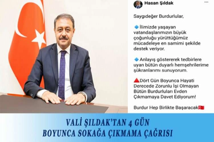 Burdur Valisi Hasan Şıldak, sosyal medya hesabından yaptığı paylaşımla Burdur halkına seslenerek, 4 gün boyunca hayati derecede zorunlu işi olmadıkça dışarı çıkılmaması çağrısında bulundu. 24 Nisan Cuma gününün idari izin olarak belirlenmesinin ardından 23 Nisan tatilinin hafta sonuyla birleşmesiyle birlikte 4 günlük bir tatil süreci başladı. Bu konuda her hafta sonu sosyal medya üzerinden Burdurlulara sokağa çıkmama konusunda uyarılarda bulunan Vali Şıldak, 4 günlük tatil için de sosyal medya hesabından yaptığı paylaşımla Burdur halkına seslenerek, 4 gün boyunca hayati derecede zorunlu işi olmadıkça dışarı çıkılmaması çağrısında bulundu. Vali Şıldak yaptığı paylaşımda; “Saygıdeğer Burdurlular, Burdur’da yaşayan vatandaşlarımızın büyük çoğunluğu yürüttüğümüz mücadeleye en samimi şekilde destek veriyor. Anlayış göstererek tedbirlere uyan bütün duyarlı hemşehrilerime şükranlarımı sunuyorum. Dört Gün Boyunca Hayati Derecede Zorunlu İşi Olmayan Bütün Burdurluları Evden Çıkmamaya Davet Ediyorum! Burdur Hep Birlikte Başaracak" dedi.
