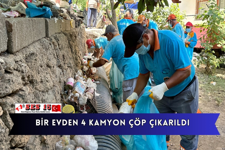 Evin içerisinde yapılan tahliye ve temizlik çalışmasında 3 kamyon çöp, bir kamyon da geri dönüşüm malzemesi çıkarıldı.