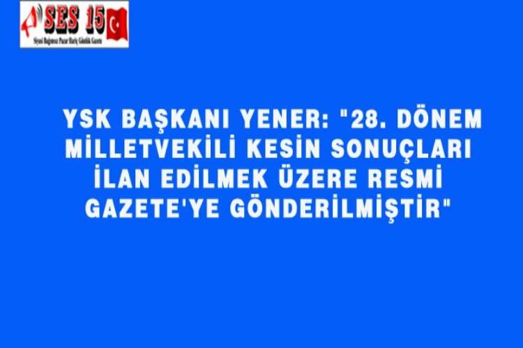 YSK Başkanı Ahmet Yener, 14 Mayıs'ta yapılan 28. Dönem Milletvekili Genel Seçimi'nin kesin sonuçlarına ilişkin kararın ilan edilmek üzere Resmi Gazete'ye gönderildiğini bildirdi. Yener, "28. dönem milletvekili kesin sonuçları ilan edilmek üzere resmi gazete'ye gönderilmiştir" dedi. AA