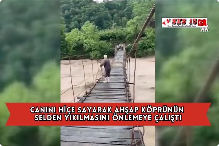 Debisi yükselmiş ırmağın sularına aldırmadan elindeki nacakla ahşap köprünün üzerine çıkan Keş, köprü altında biriken ağaç dallarını uzaklaştırmaya çalıştı. Hasan Keş'in kuzeni Halil Keş ise bu anları cep telefonuyla kaydetti.