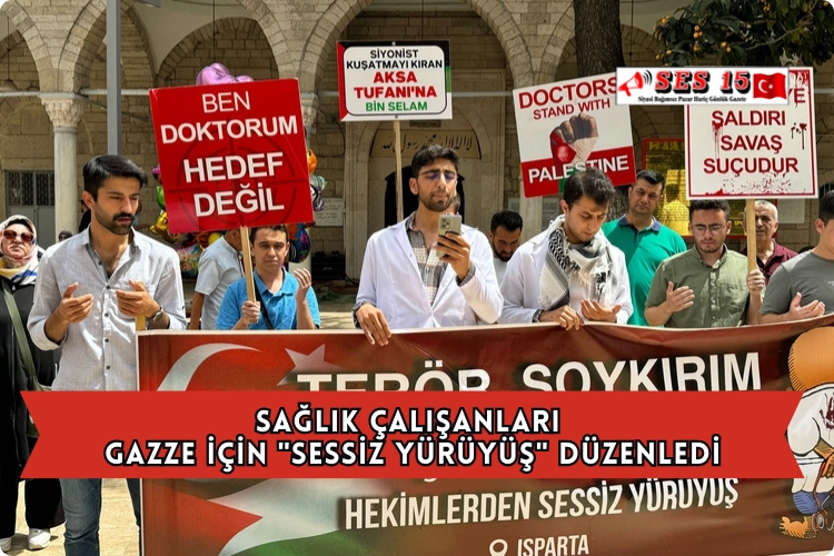 Isparta'da, Kaymakkapı Meydanı'ndaki Gazze çadırı önünde toplanan tıp fakültesi öğrencileri ve sağlık çalışanları, ellerindeki dövizlerle Mimar Sinan Camisi önüne yürüdü.