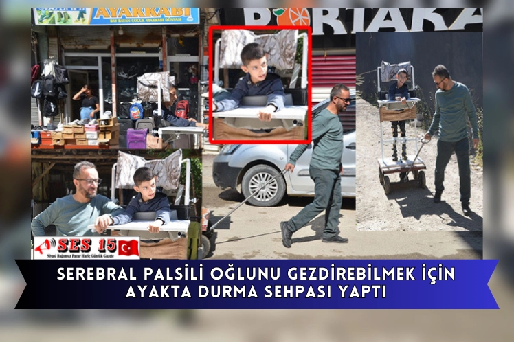 Günün belli saatlerinde oğlunu evden alarak "ayakta durma sehpası"na yerleştiren baba, çarşı merkezi ve mahallelerde dolaştırarak keyifli vakit geçirmesini sağlıyor.