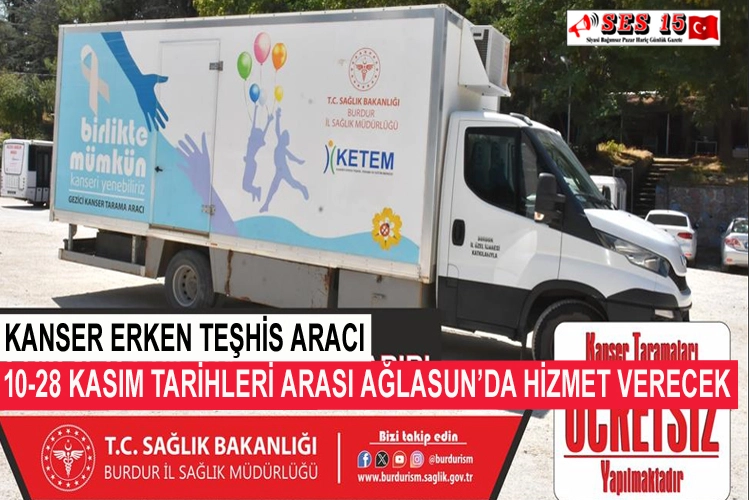 Konuyla ilgili olarak Burdur İl Sağlık Müdürlüğü tarafından yapılan açıklamada; “Kanser Erken Teşhis, Tarama Ve Eğitim Merkezi (KETEM) (Mobil Mamografi ve Serviks Kanseri Tarama) aracımızla Ücretsiz Kanser Taramaları İçin 10-28 Kasım tarihleri arasında Ağlasun’dayız!