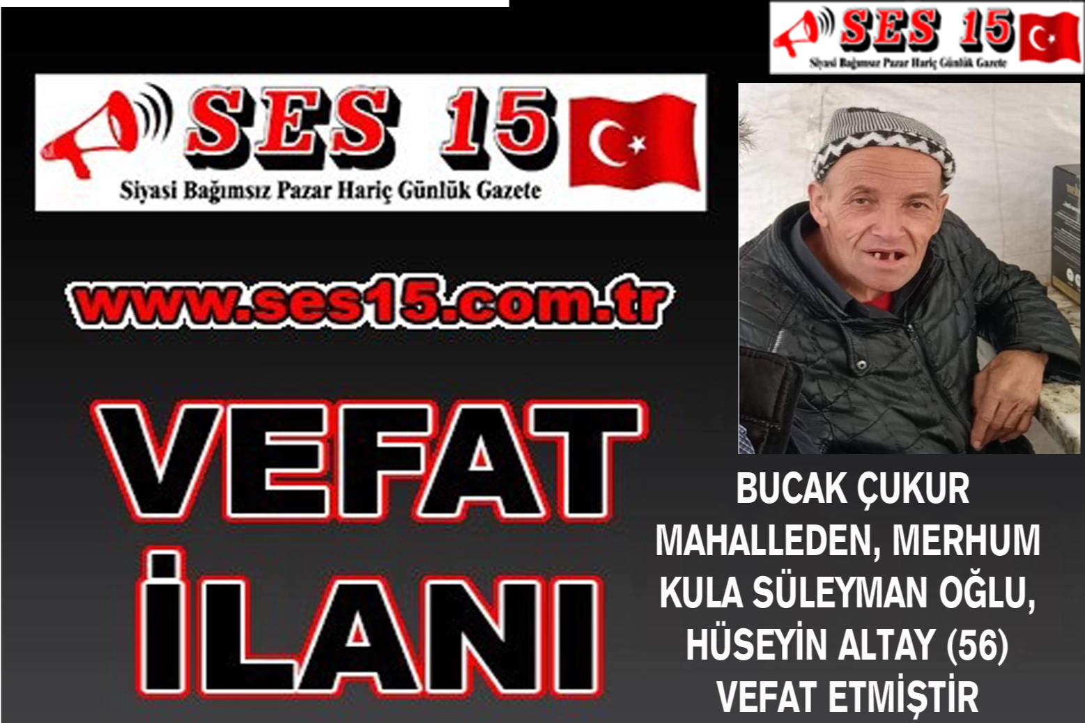 Çukur mahalleden, merhum Kula Süleyman oğlu, Hüseyin Altay (56) vefat etmiştir.