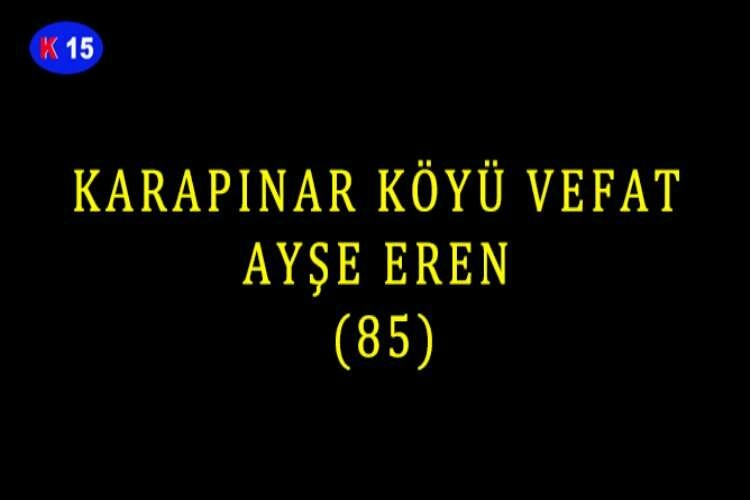 Karapınar köyünden, Merhum Bekir Eren eşi Ayşe Eren(85) vefat etmiştir. Damadı Eşraf Baydar: 0532 322 83 65 NOT: Pandemi sürecinden dolayı Cenazeler sadece birinci derece yakınları tarafından defnedilecektir. Geçmişlerimizin, sevdiklerimizin, geride bir Fatiha okuyacak kimsesi kalmamış Müslüman kardeşlerimizin , Vatanımız ve Dinimiz uğruna şehit olan tüm Şehitlerimizin ruhları için, ALLAH Rızası için, 1 Fatiha 3 ihlas-ı Şerif okuyalım.