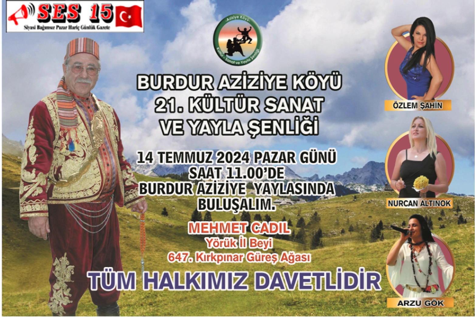 Saat 11.00’de başlayacak olan “Aziziye Köyü 21. Kültür, Sanat ve Yayla Şenliği’nde Türk Halk Müziği Sanatçıları Arzu Gök, Nurcan Altınok ve Özlem Şahin sahne alacak. Burdur Yörük İl Beyi, 647. Kırkpınar Güreş Ağası Hayırsever İş İnsanı Mehmet Cadıl ve Aziziye Köyü Muhtarı Ali Kozak, Burdur merkez, ilçe, belde ve köyleriyle çevre il ve ilçelerden herkesi şenliğe davet etti. Aziziye Köyü 21. Kültür, Sanat ve Yayla Şenliği, 14 Temmuz Pazar günü, Kanal 15 ekranlarından canlı yayınla izleyicilere aktarılacak.