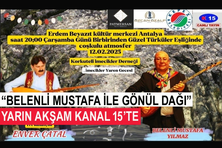 Kanal 15 ekranlarında 15 günde bir Çarşamba akşamları yayınlanan “Belenli Mustafa ile Gönül Dağı” programı 12 Şubat 2025 Çarşamba akşamı (yarın)canlı yayınla sizlerle olacak.
