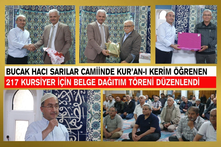 Bucak Müftülüğüne bağlı Hacı Sarılar Camiinde Cami İmam Hatibi Şahin Gürcan tarafından 7’den 70’e Kur’an-ı Kerimi öğrenmek isteyenlere yönelik gerçekleştirilen kursta Kur’an-ı öğrenen 217 kursiyer için belge dağıtım töreni düzenlendi.