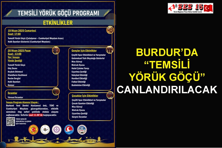 Burdur Valiliği tarafından gerçekleştirilecek olan “Temsili Yörük Göçü”, 19 Nisan Cumartesi ve 20 Nisan Pazar günü yapılacak. 19 Nisan Cumartesi günü saat 17.00’de Çatalpınar-Cumhuriyet Meydanı arasında “Yörük Göçü” gerçekleştirilecek. Yörük Göçünün ardından Cumhuriyet Meydanında halk oyunları gösterisi sunulacak. “Temsili Yörük Göçü” kapsamındaki etkinlikler, 20 Nisan Pazar günü saat 13.00’de İnsuyu Mağarası girişinde devam edecek. İnsuyu Mağarası girişindeki etkinlikler, Kanal 15 ekranlarından da canlı yayınlanacak. Program ile ilgili değerlendirmede bulunan Burdur Valisi Tülay Baydar Bilgihan; “Yörük kültürü, bu toprakların ruhudur. Asırlardır Toroslar’ın eteklerinden ovaya uzanan bu yolculuk, sadece bir göç değil; bir yaşam biçimidir, bir değerler bütünüdür. Bu vesileyle hep birlikte geçmişimizle bağ kuruyor, kültürümüzü yaşatıyor ve geleceğe aktarıyoruz. Herkesi bu güzellikleri paylaşmaya, etkinliğimize katılmaya davet ediyorum ”dedi.