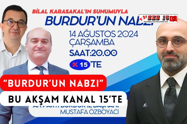 Kanal 15 ekranlarında yayınlanan “Burdur’un Nabzı” programı yarın akşam MAKÜ Stüdyosu’ndan canlı olarak ekranlara gelecek. Bilal Karasakal’ın moderatörlüğünü yaptığı programın bu akşamki bölümünde AK Parti Burdur İl Başkanı Mustafa Özboyacı ve Burdur Gazeteciler Cemiyeti Başkanı Kürşat Tuncel yer alacak. bu akşam saat 20.00’de MAKÜ Stüdyosu’ndan yayınlanacak olan “Burdur’un Nabzı” programını sakın kaçırmayın.