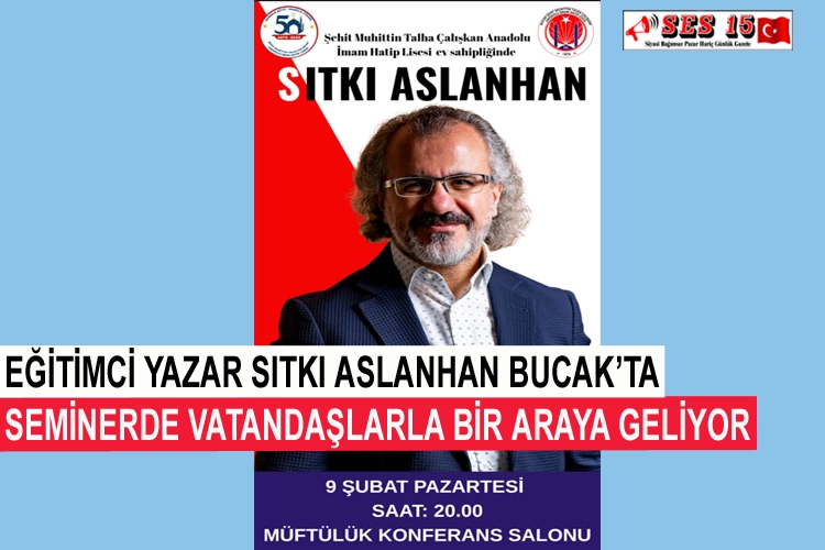 Eğitimci Yazar Sıtkı Aslanhan bugün akşam saat 20.00’da Şehit Muhittin Talha Çalışkan Anadolu İmam Hatip Lisesi ev sahipliğinde Bucak Müftülüğü konferans Salonunda Güçlü Aile Güçlü Nesil konulu seminerde vatandaşlarla bir araya gelecek. .