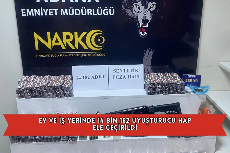 Adreslerde 14 bin 182 sentetik uyuşturucu hap, 10 gram esrar, ruhsatsız tabanca ve tüfek ele geçirildi.