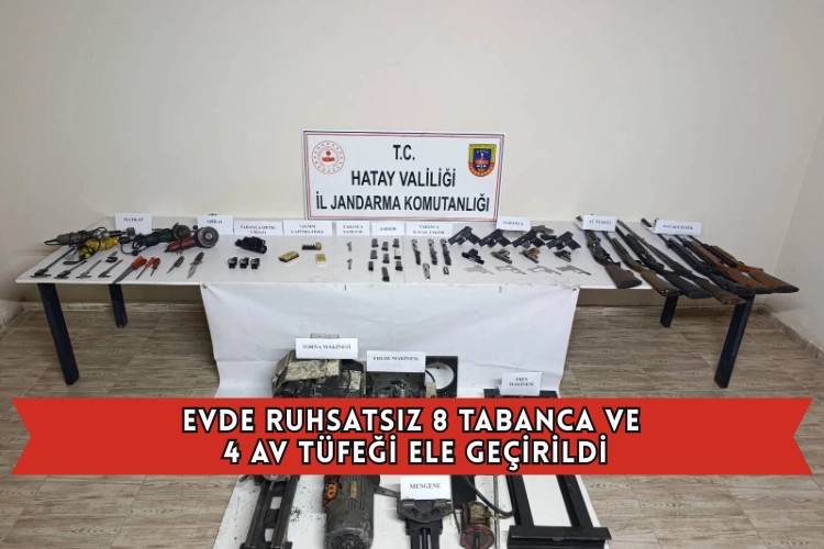 Söz konusu evde, ruhsatsız 8 tabanca ve bu silahlara ait şarjör ile mermi , 4 av tüfeği, 3 havalı tüfek, tabanca optik cihazı ile silah imalatında kullanıldığı değerlendirilen aletler ele geçirildi.