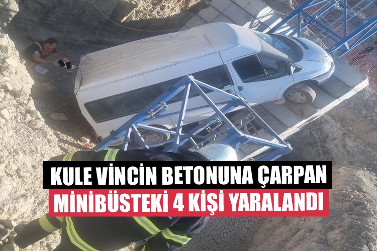 Sürücüsünün ismine ulaşılamayan minibüs, Mağaracık Mahallesi'ndeki şantiye alanında kontrolden çıkarak kule vincin ayağındaki beton bloka çarptı.