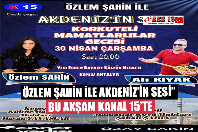Kanal 15 ekranlarında Çarşamba akşamları yayınlanan “Özlem Şahin ile Akdeniz’in Sesi” programı bu akşam sezon finaliyle sizlerle olacak. Özlem Şahin’in hazırlayıp sunduğu “Akdeniz’in Sesi” programının bu haftaki konuğu Ali Kıyak olacak. Özlem Şahin ve konuğu Ali Kıyak sevilen türküleri, canlı yayında sizler için seslendirecek. Antalya Erdem Bayazıt Kültür Merkezi’nden bu akşam saat 20.00’de yayınlanacak olan “Özlem Şahin ile Akdeniz’in Sesi” programını sakın kaçırmayın. Ayrıca program halka açık ve ücretsiz.