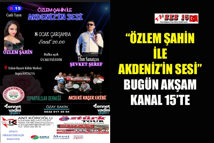 Kanal 15 ekranlarında 15 günde bir Çarşamba akşamları yayınlanan “Özlem Şahin ile Akdeniz’in Sesi” programı bugün akşam canlı yayınla sizlerle olacak.