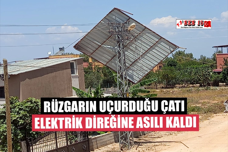 Adana'nın merkez Sarıçam ilçesinde, şiddetli rüzgar nedeniyle uçan trafonun çatısı elektrik direğinde asılı kaldı.